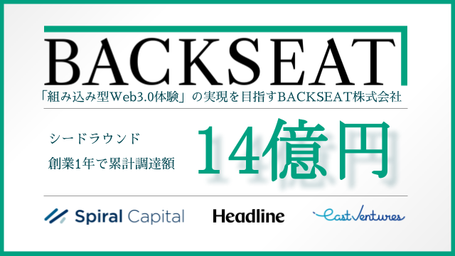 パートナー企業の既存サービスに組み込み、ユーザーにとって身近なサービスに融合した形でWeb3.0体験を提供し、ブロックチェーン技術の社会実装を目指すBACKSEAT株式会社(本社:東京都千代田区、代表取締役社長:林 政泰、以下「BACKSEAT」)は、このたびSpiral Capital及びHeadline Asiaを共同リード投資家、East Venturesをフォロー投資家として迎え、第三者割当増資を実施したので、お知らせいたします。創業からの累計資⾦調達額は約14億円となりました。